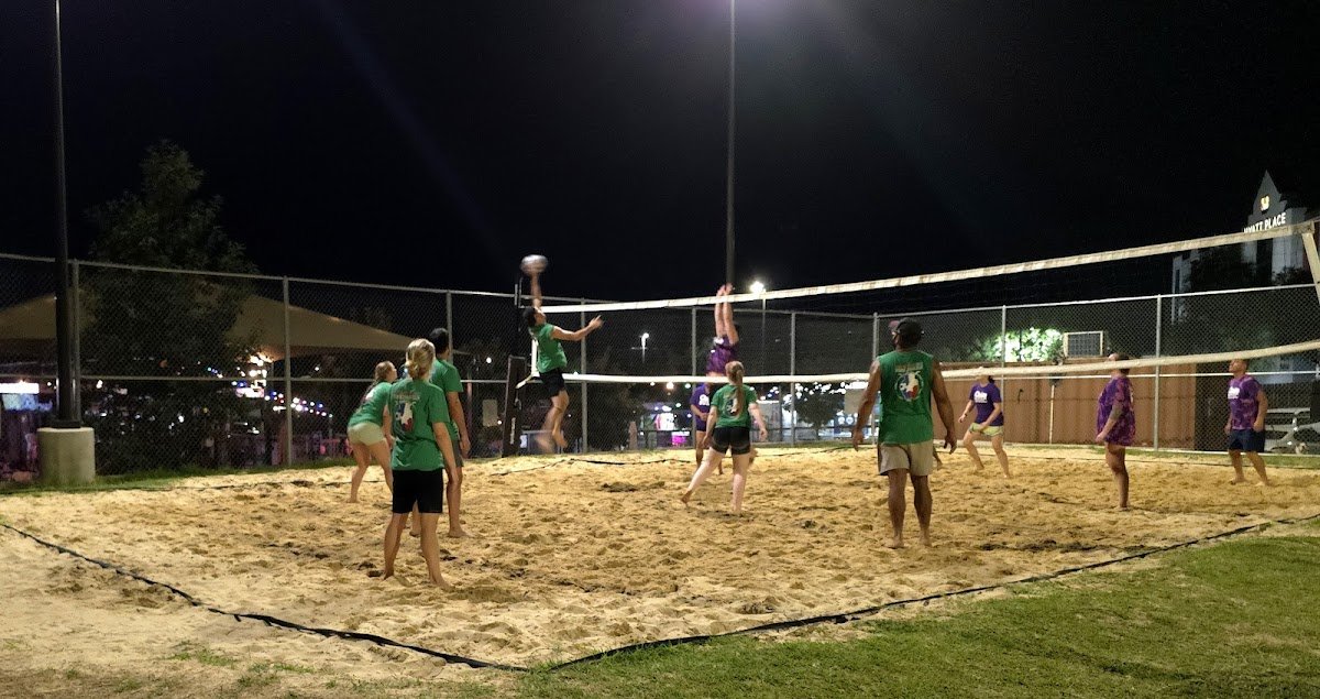 Dog-friendly icehouse with two bookable sand volleyball courts plus live music and food trucks.