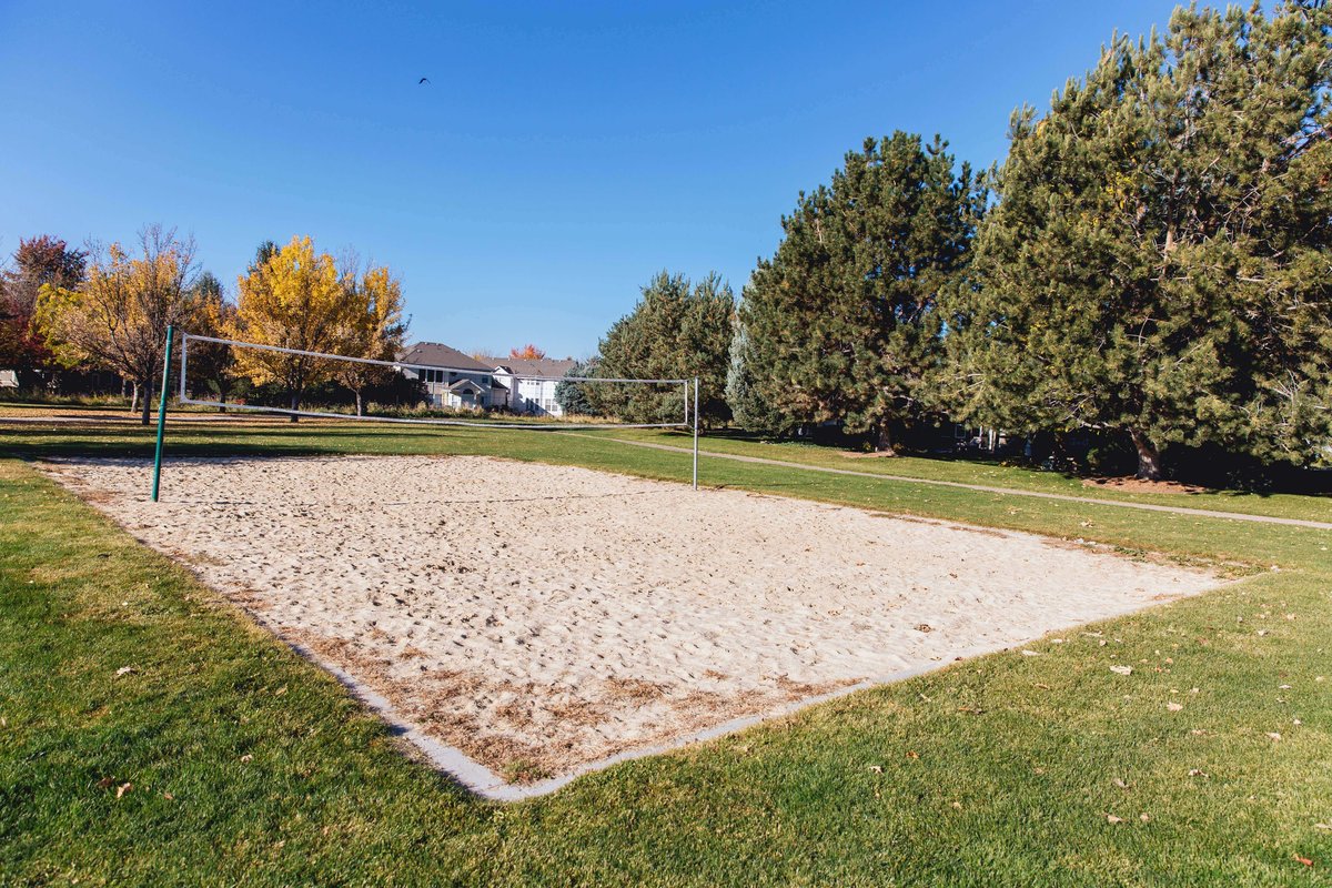 Community park in West Boise with a sand volleyball court alongside picnic shelters and walking paths.