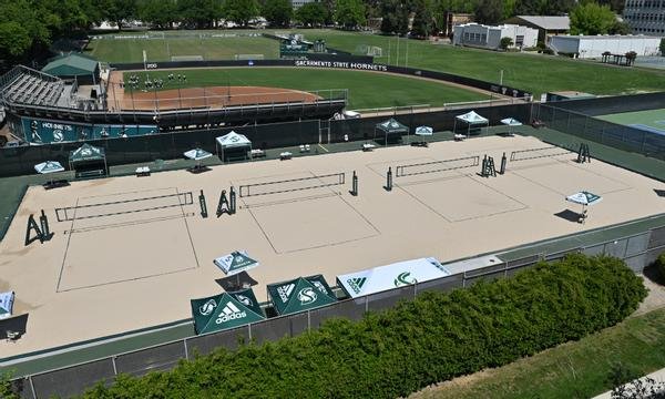 Four-court sand volleyball facility at Sacramento State used for NCAA beach volleyball and community events.
