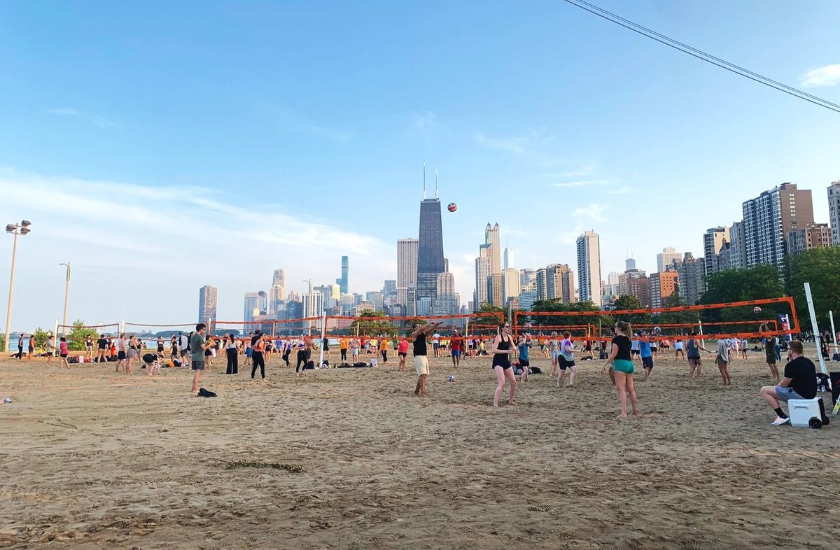Massive lakefront beach in Uptown with rows of sand volleyball courts along Lake Michigan.