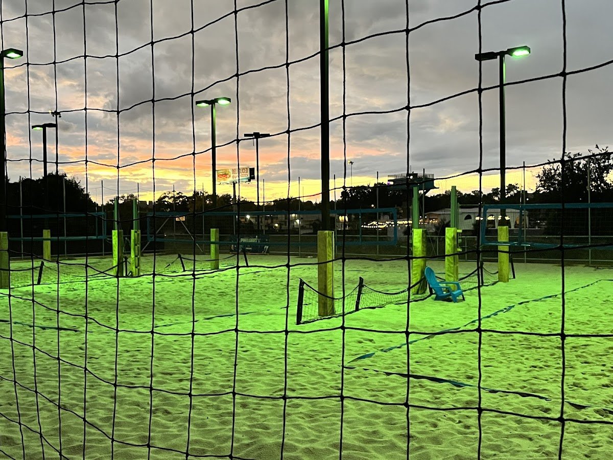 Sports bar in a restored 1920s bungalow with three professional illuminated sand courts in the Heights.